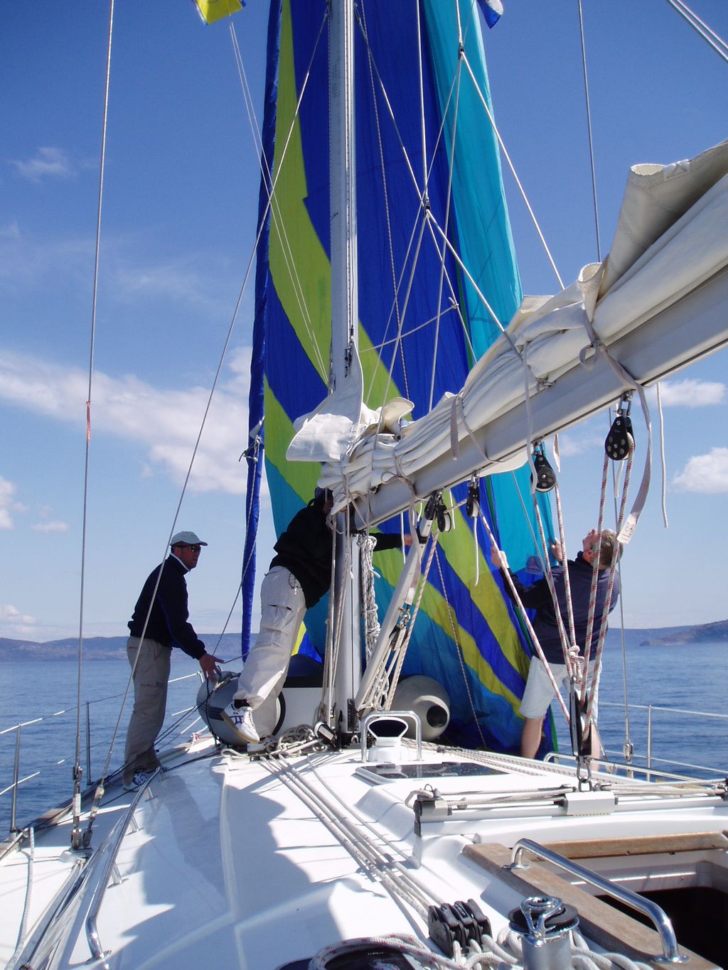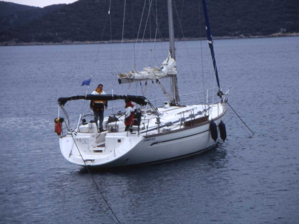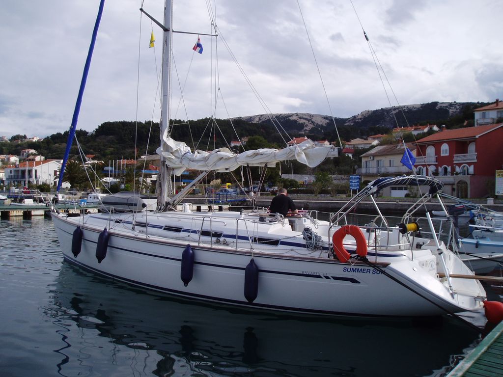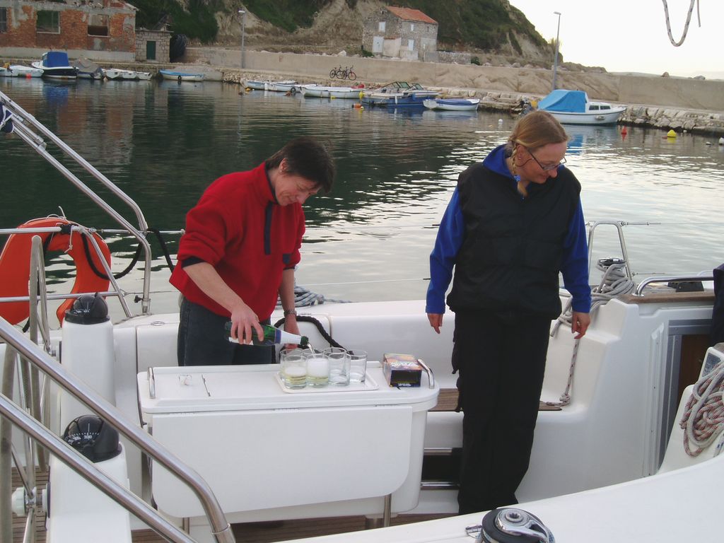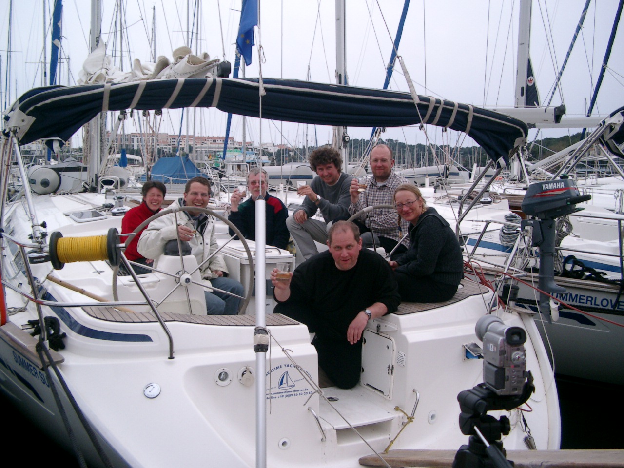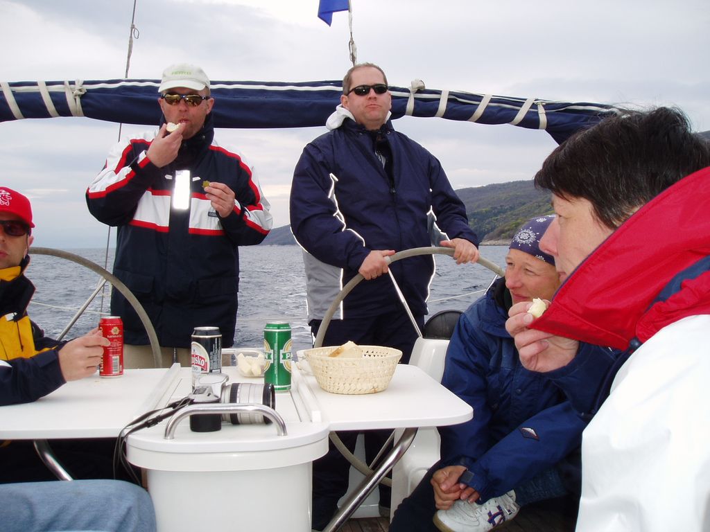 Zurück in Pula: Doro, Thomas, Jürgen, Thomas, Herbert, Markus, Diana. Nach einem schönen Abschluss-Essen im Restaurant der Marina Pula starteten wir zur Heimfahrt und trafen am Samstag Morgen um 8:00 Uhr wieder mit den beiden Hilfsmatrosen (Tasche im Vordergrund) in Ispringen ein.