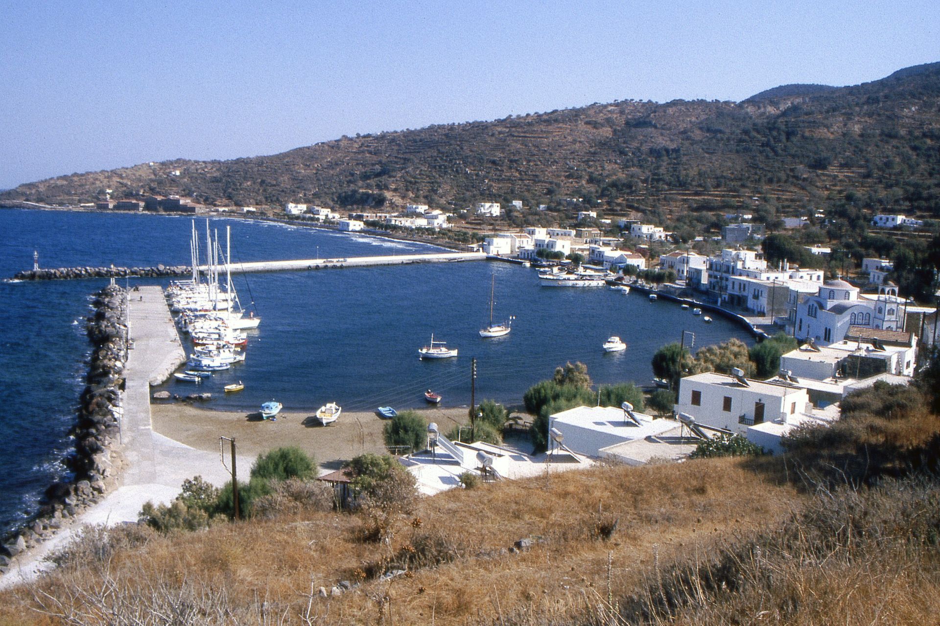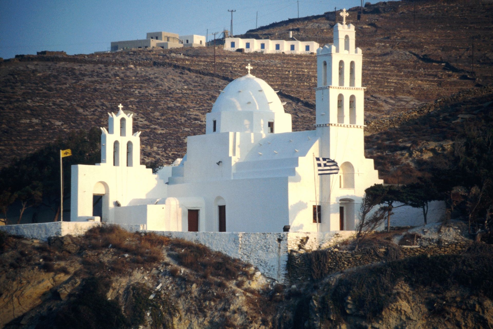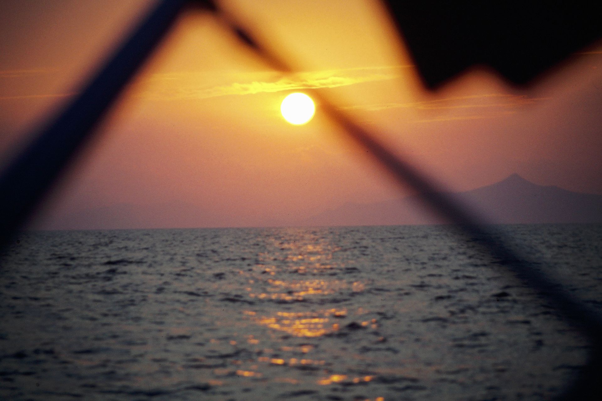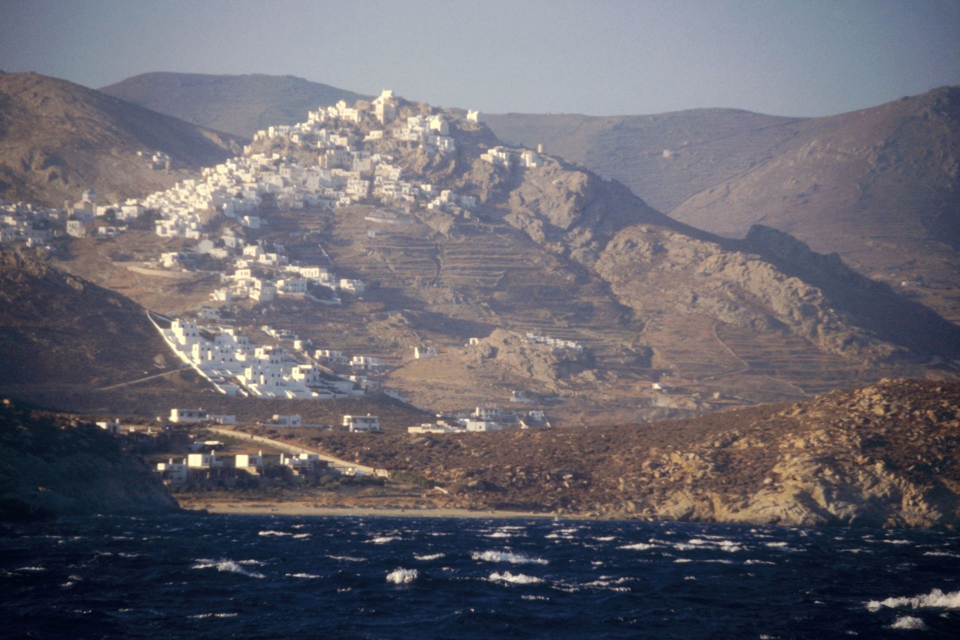 Bei vier bis fünf Windstärken kamen wir gut voran. Unterwegs sahen wir eine Fähre und rätselten, ob unsere Freunde wohl an Bord seien - während sie an Deck dieser Fähre überlegten, ob der einsame Segler wohl wir seien. Leider war der Abstand zu groß, sonst hätten sie unseren bunten Hund gleich erkannt: Blaue Genua, jetzt ein grünes Groß und roter Unterwasseranstrich ! In Ios kamen wir noch vor Sonnenuntergang an. Sehr malerisch schmiegt sich eine Kapelle an die Einfahrt der Bucht. Ansonsten ist Ios ähnlich schroff und karg wie Seriphos. Während der Dämmerung machten wir noch einen kleinen Landausflug und genossen herrliche Ausblicke auf die Bucht im letzten Tageslicht.