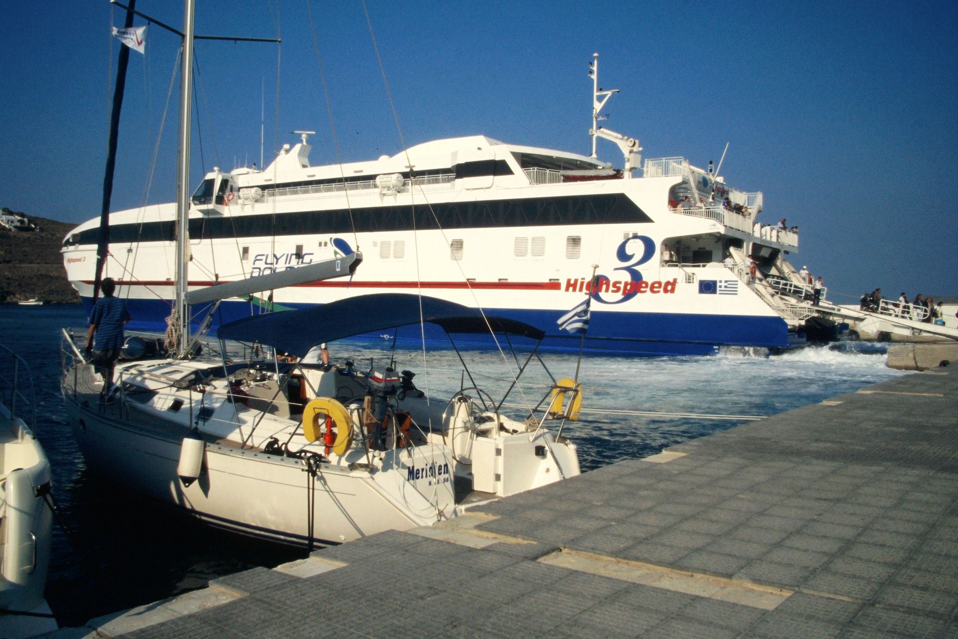 Pünktlich um 10:30 Uhr waren wir am Fähranleger und die Fähre legte wenig später kurz an. Zu unserem größten Erstaunen war tatsächlich ein verpacktes Segel mit der Aufschrift "Meridien" an Bord. Da der Wind im Laufe des Vormittags schon wieder stark zugenommen hatte und keine Yacht ausgelaufen war, also alle Kaiplätze weiterhin belegt waren, entschieden wir uns, wie geplant nach Paros zu segeln, um das Segel in dem größeren Hafen dort zu wechseln.