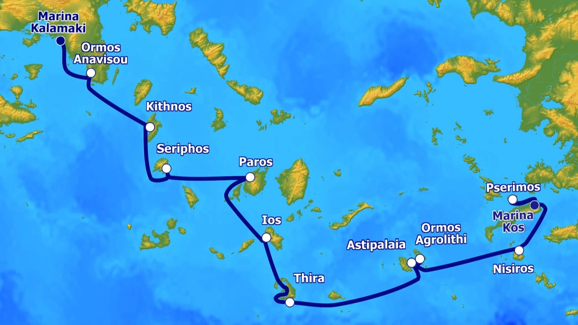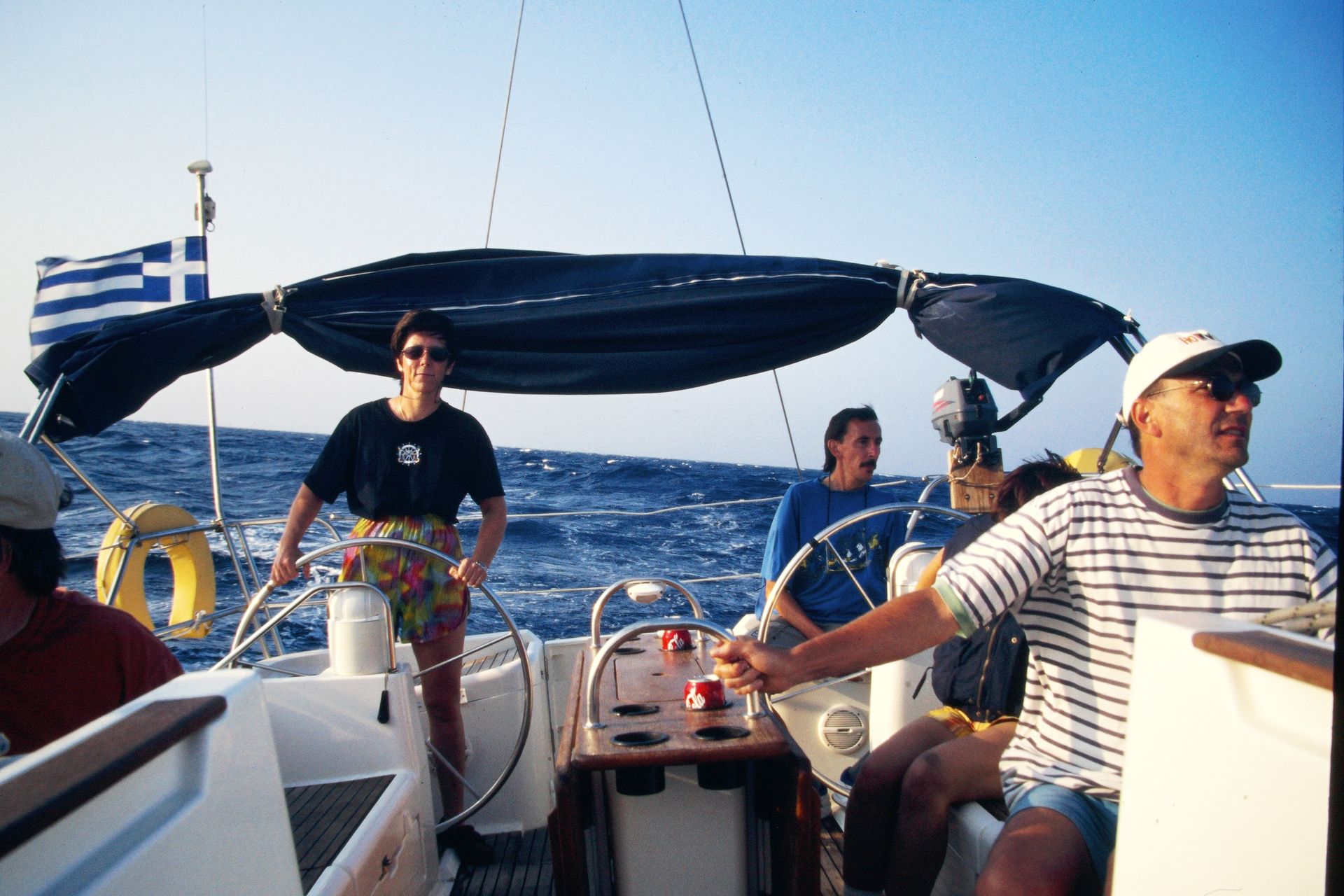 Während der Überfahrt bei idealem Halbwind kamen wir nun auch erstmals in offenere Gewässer und die See wurde deutlich rauher. Bei weiterhin strahlend blauem Himmel, 30 Grad und einem tadellos laufenden Schiff (ideal die zwei Steuerräder!) hatten alle ihren Spaß - bis auf Birgit. Weniger aufs Sportsegeln aus, hatte sie am Vortag schon Probleme, die sie allerdings noch gut versteckt hatte. Jetzt aber wurde es ihr zu heftig. Bei ab Mittag gut 30 Knoten Wind (Windstärke 7) und einer kurzfrequent seitlich einlaufenden See mit zwischendurch immer wieder über drei Metern und reichlich Spritzern bekam sie einfach Angst. Da halfen auch keine Erklärungen über Unsinkbarkeit, Physik usw. oder der Vorschlag Rettungsweste und Lifeline anzulegen. Sie schaffte es aber schließlich, die Überfahrt unter Deck und ohne größere Übelkeit hinzubekommen.