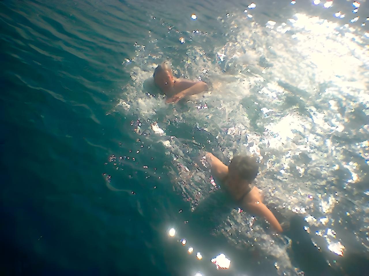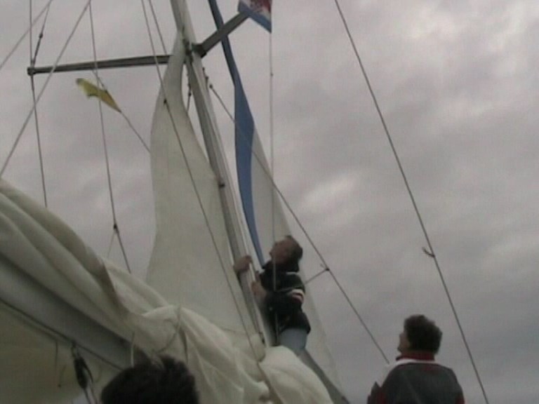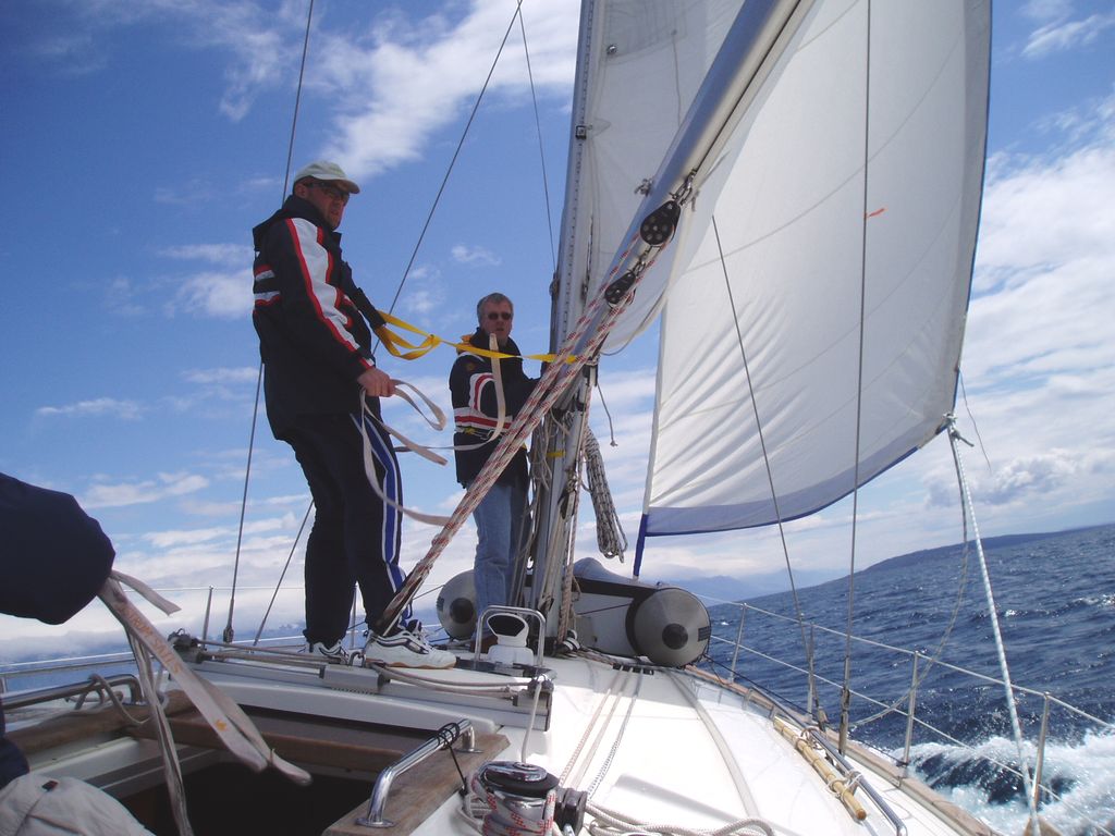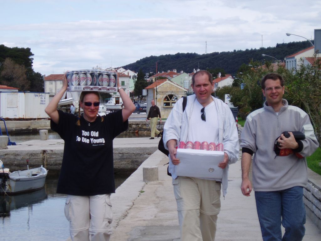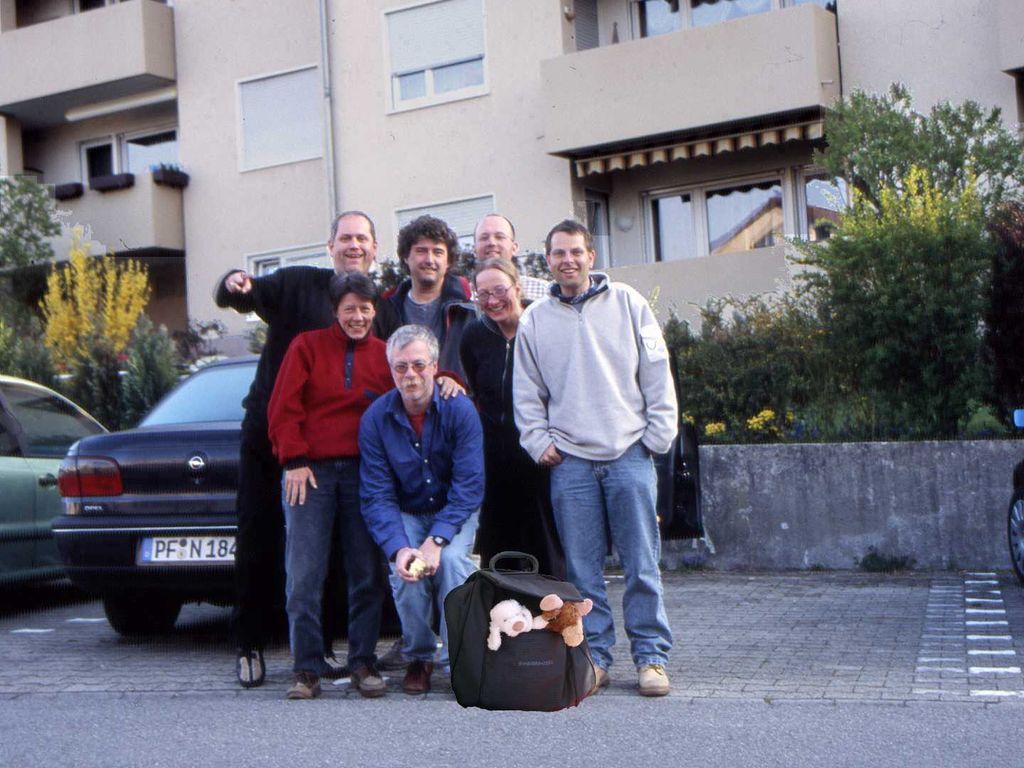 Zurück in Pula: Doro, Thomas, Jürgen, Thomas, Herbert, Markus, Diana. Nach einem schönen Abschluss-Essen im Restaurant der Marina Pula starteten wir zur Heimfahrt und trafen am Samstag Morgen um 8:00 Uhr wieder mit den beiden Hilfsmatrosen (Tasche im Vordergrund) in Ispringen ein.