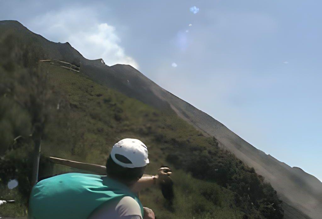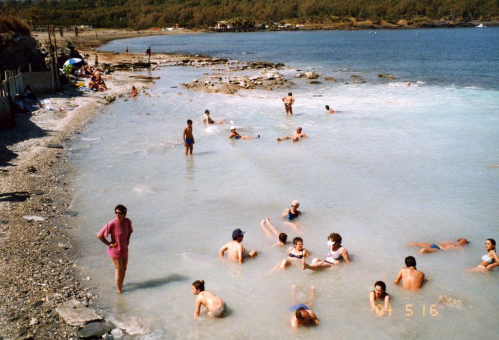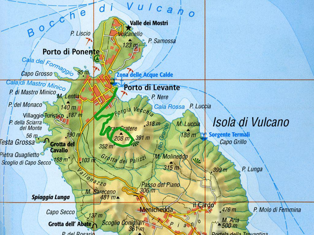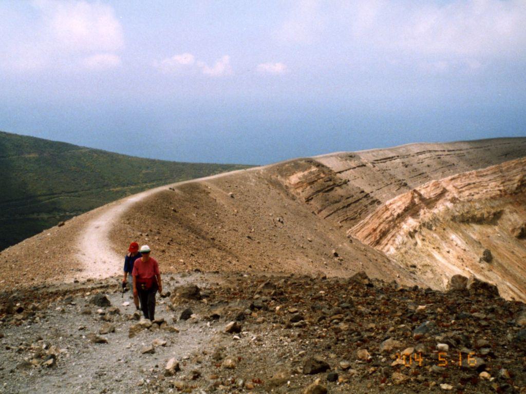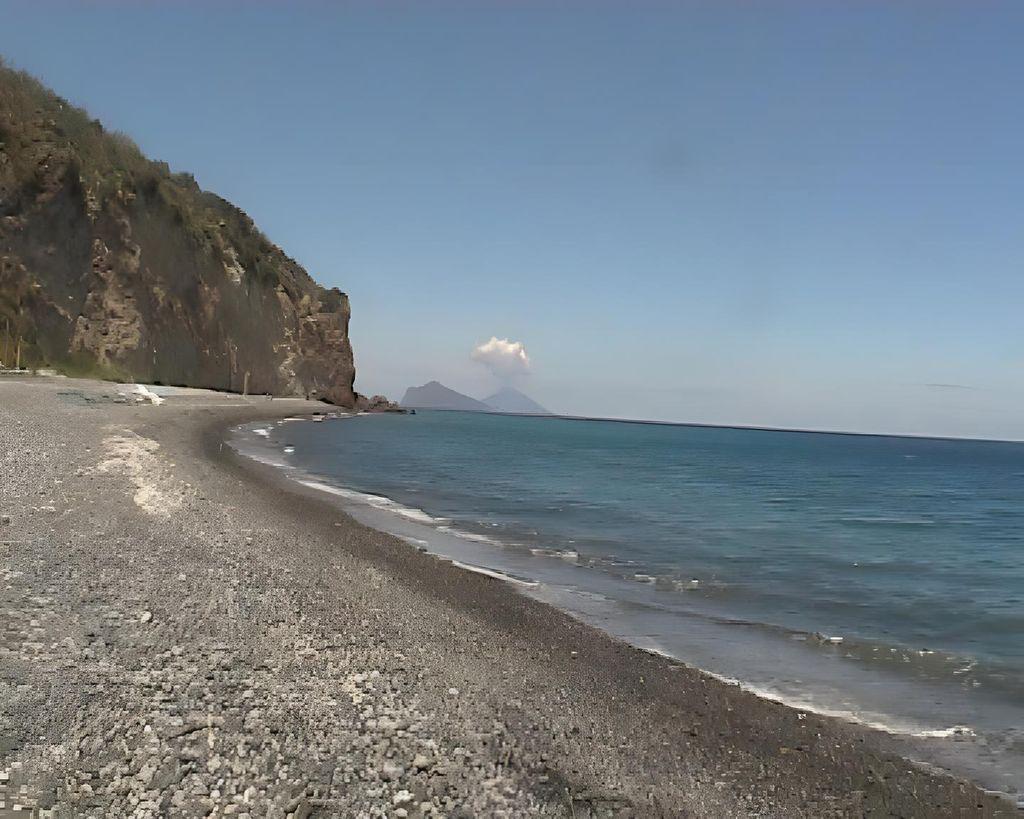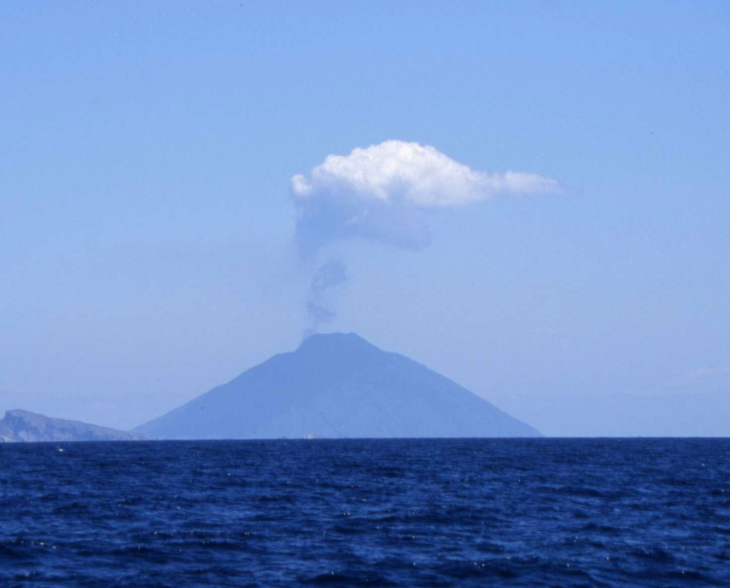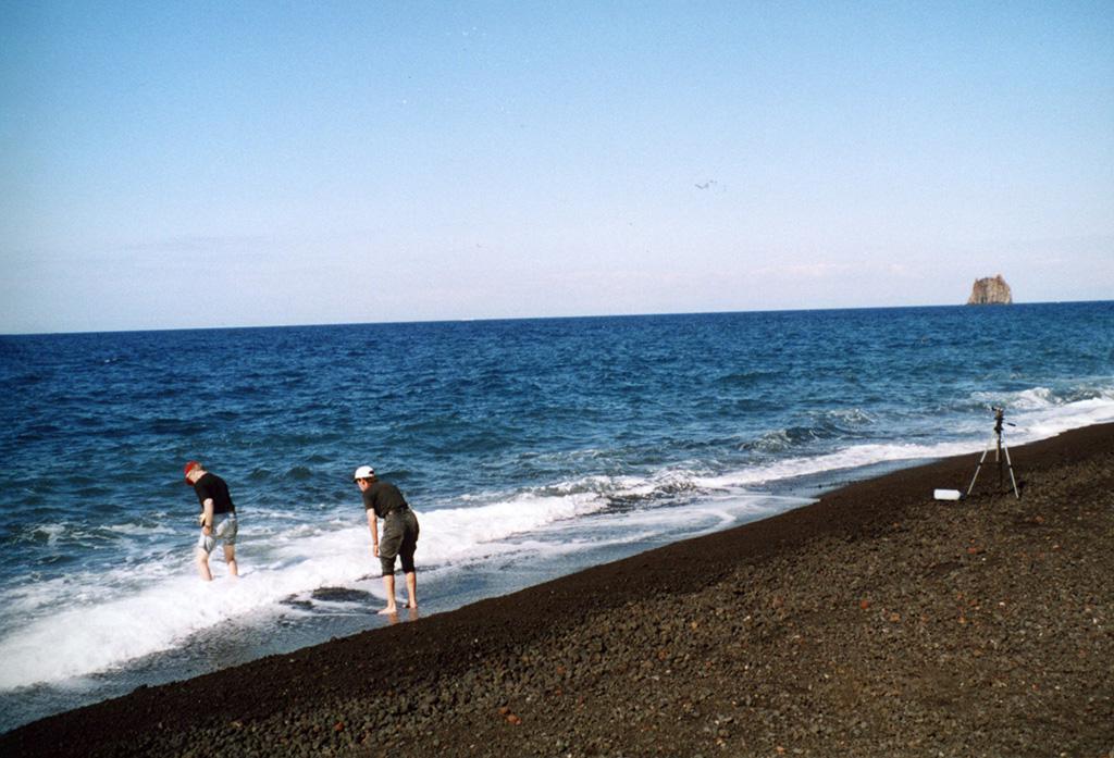 Natürlich wollten wir auf den Vulkan wandern. Das Ausbleiben der regelmäßigen Ausbrüche ist jedoch mit dem Risiko eines größeren Ausbruchs verbunden, so daß der Aufstieg nur bis etwa 400m Höhe freigegeben war. Hier sind wir am Umkehrpunkt unmittelbar neben dem Lavafeld "Sciara del Fuoco" des letzten großen Ausbruchs von 1930. Alle Strände von Stromboli haben schwarze Schotterstrände, hier am Strand von Faraglione. Im Bildhintergrund ist Strombolicio zu erkennen.