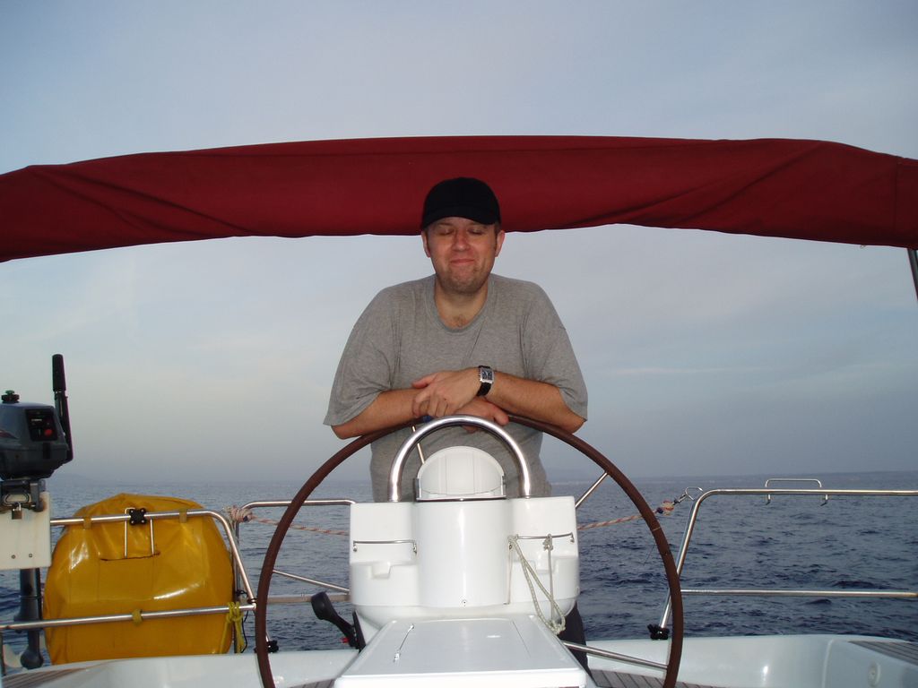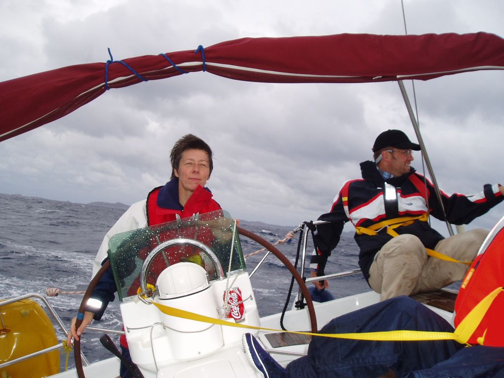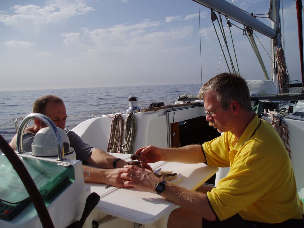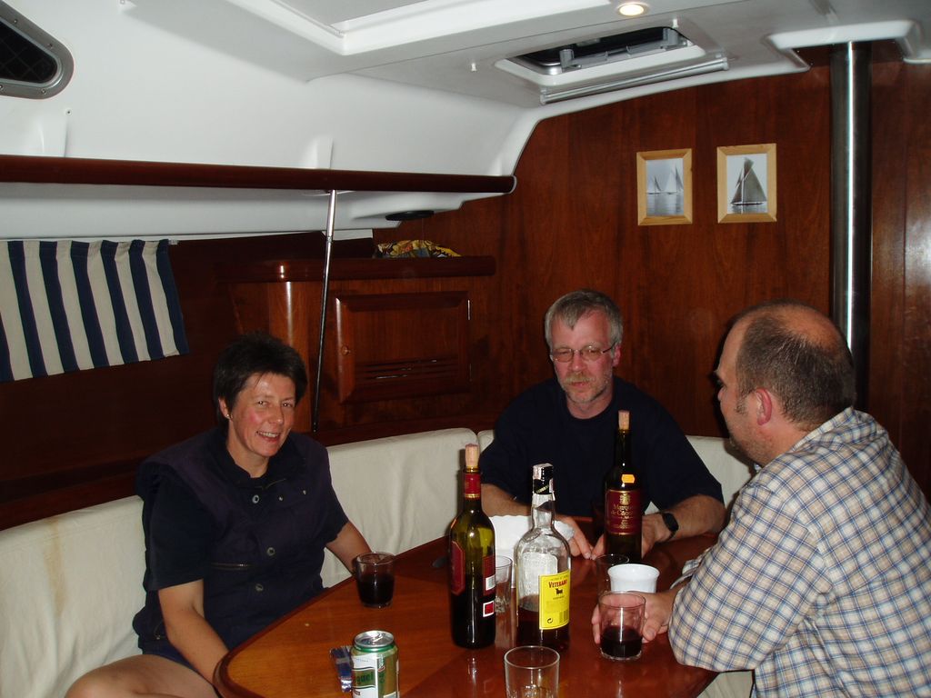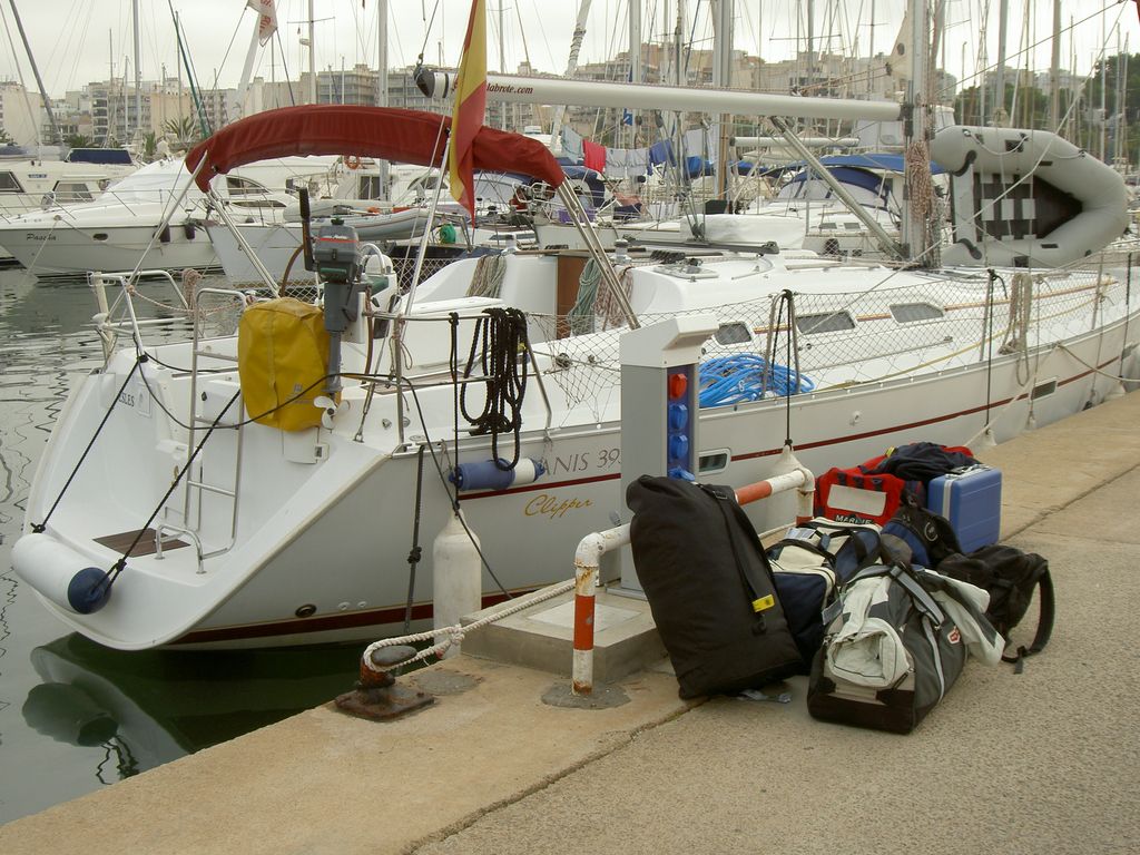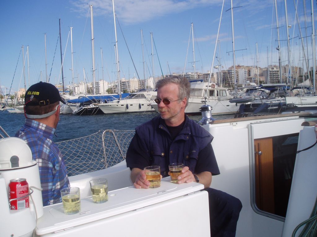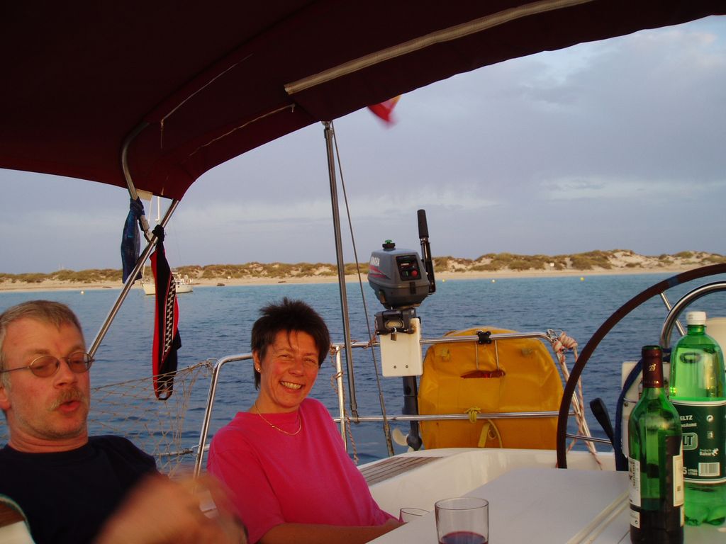 Nach Sonnen, Baden und Entspannen zog es am Abend plötzlich zu. Binnen kurzer Zeit baute sich starker Westwind auf, der direkt in die Bucht blies. Yacht um Yacht lief aus. Als gegen 21 Uhr auch unser Anker bei mittlerweile 30 Knoten Wind slippte, verlegten wir uns in den 5sm südlich gelegenen Hafen 'Puerto de la Sabina'. Es war noch Marinapersonal anwesend und man wies uns einen denkbar ungeeigneten Liegeplatz zu. Bei 30 Knoten von schräg seitlich auflandigem Wind und außerdem nur spärlichem Lampenlicht legten wir 'nordeuropäisch', also mit dem Bug voraus an, um größeren Stress zu vermeiden.