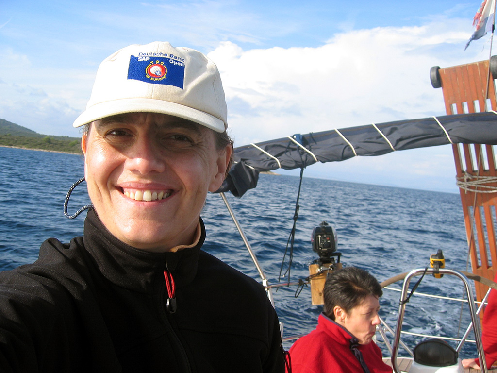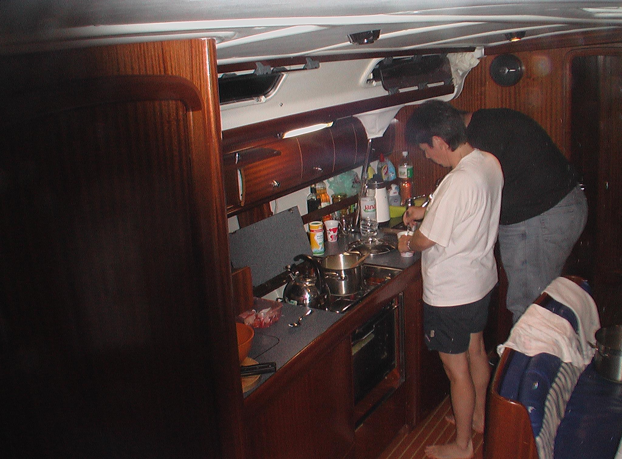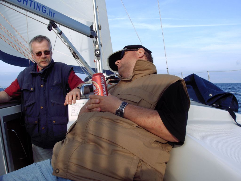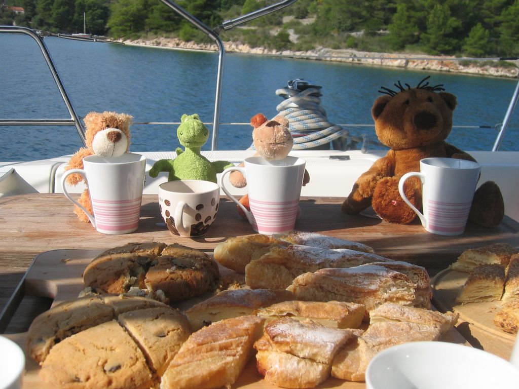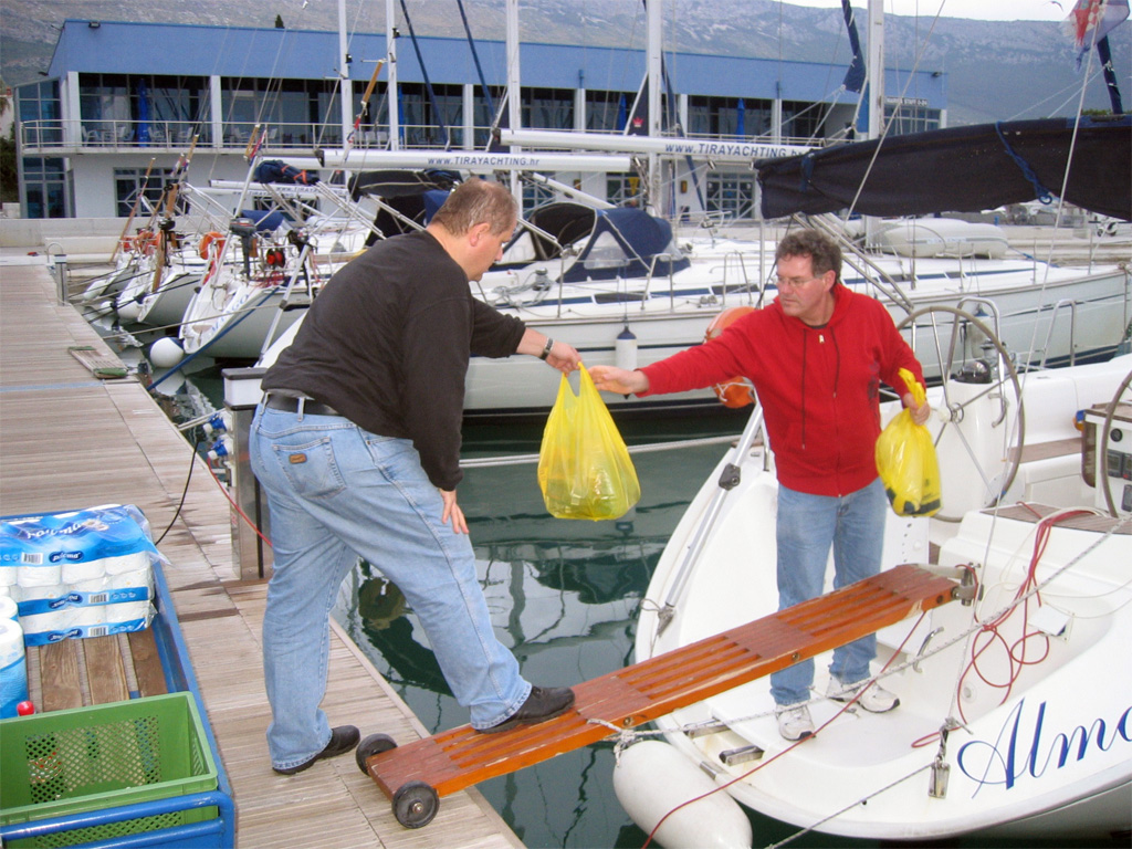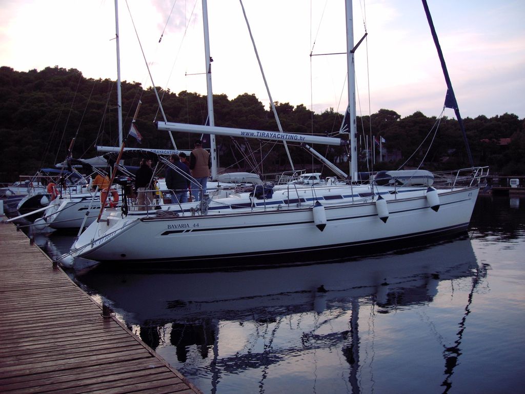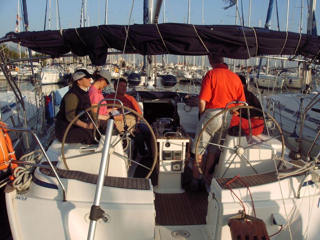Für unsere Crew hatten wir die Bavaria 44 'Alma II' bei 'Tira Yachting' gechartert. Die Übergabe erfolgte freundlich, schnell und unkompliziert. Dennoch waren wir mit Einkaufen und Einräumen bis gegen 17:00 beschäftigt, da insbesondere das Verstauen diverser Rollen (ähem!) Toilettenpapier doch einige Zeit in Anspruch nahm. Herbert hatte Tagesbedarf verstanden, wo Wochenbedarf gemeint war (grins). So liefen wir kurz vor Dämmerungsbeginn nicht mehr aus. Stattdessen wurden ausgiebig gekocht, um uns nach den Entbehrungen der langen Anreise wieder zu stärken.