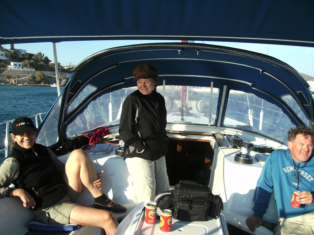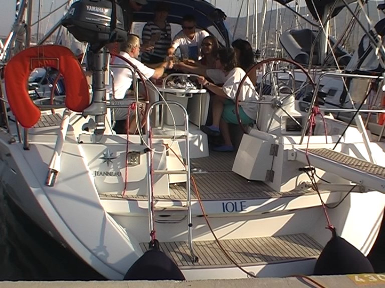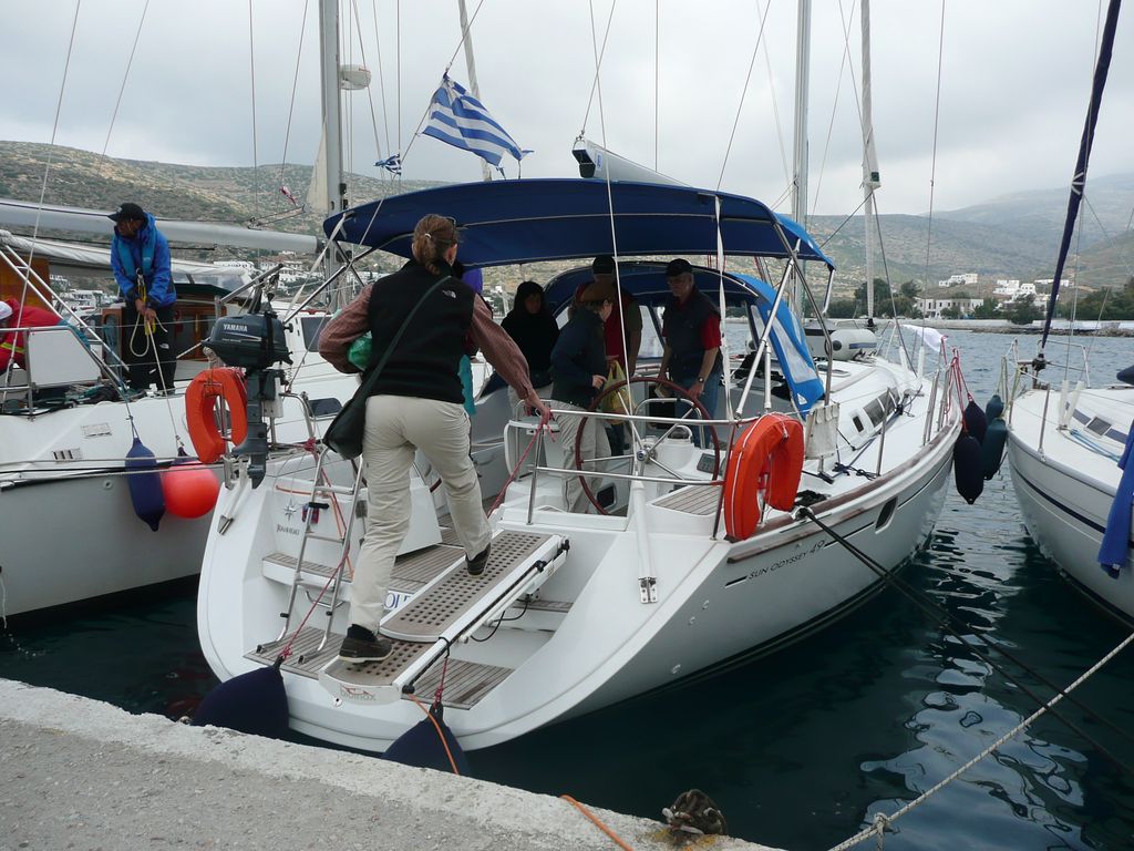 Frühes Aufstehen war angesagt, schon um 6:05 startete unser Flug von Stuttgart nach Athen. Der Flug verlief planmäßig und wir landeten 10:15 Ortszeit (1 Stunde Zeitverschiebung) in Athen. Von dort fuhren wir mit dem Expressbus E96, der direkt an der Marina Alimos (Kalamaki) hält, wo wir um 11:30 eintrafen. Unsere 'Iole' (eine ein halbes Jahr junge Sun-Odyssey 49i von Athenian Yachts) befand sich in einem vorzüglichen Zustand und verfügte über eine hervorragende Ausstattung, u.a. eine hydraulische Gangway! Die 49i ist ein sehr gelungenes Schiff, wenngleich die beiden vorderen Kabinen trotz der Größe des Schiffes etwas knapp für zwei Erwachsene ausfallen. Aber es gibt dennoch üppig Platz für 8 Personen, schließlich verfügt jede Kabine ja über ein eigenes Bad.