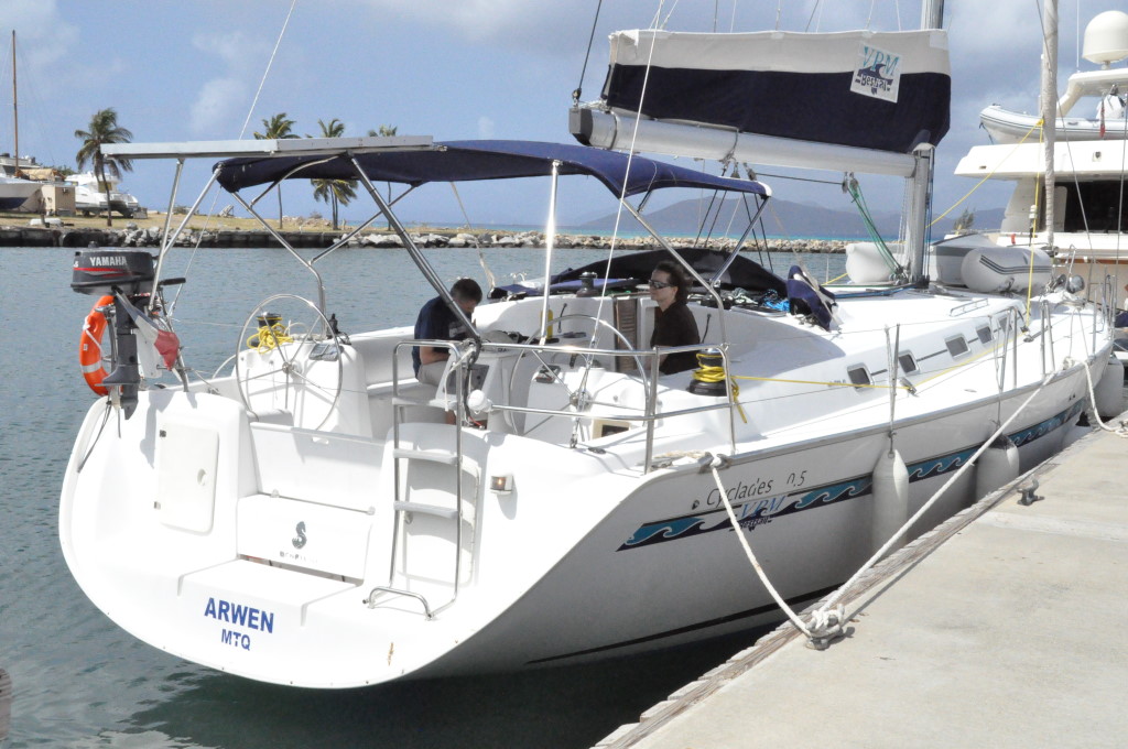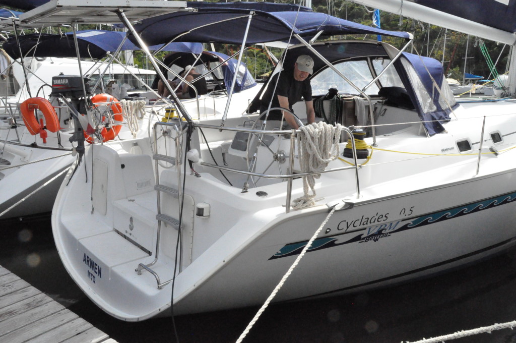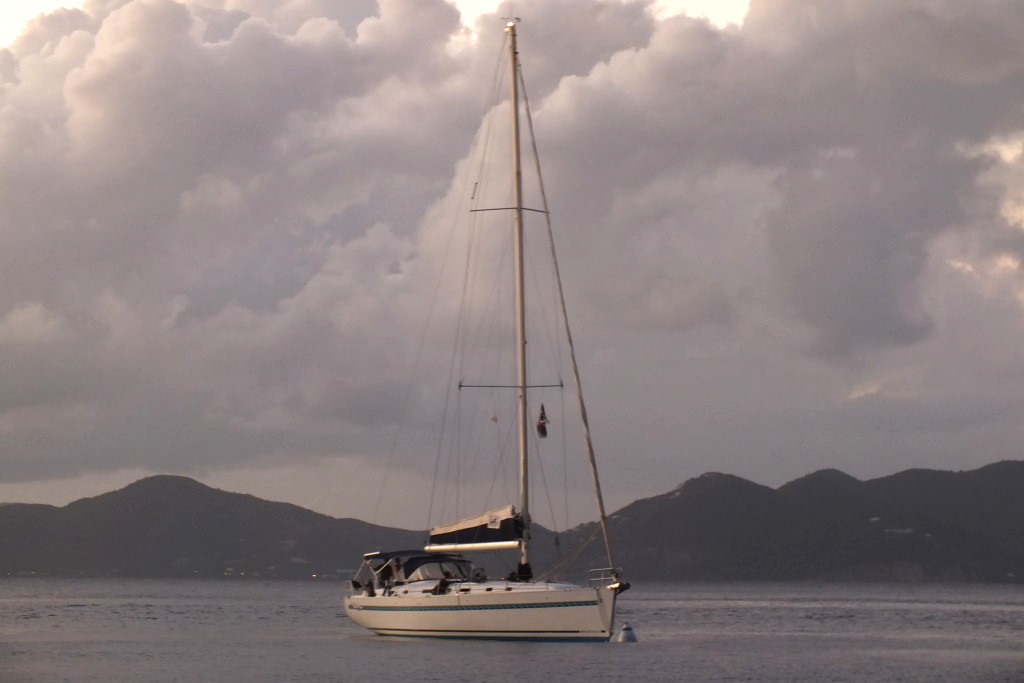 Unser Festmacher hatte sich offenbar an einer scharfen Kante der Bojenöse, die wir nicht bemerkt hatten, durchgescheuert. Es war natürlich reichlich blöd, bei dem etwas rostigen Zustand der anscheinend selten benutzten Bojen keinen zweiten Festmacher zur Sicherung angebracht oder einfach nur den Anker prophylaktisch mit etwas Kette auf Grund ausgelegt zu haben. Doch das half jetzt nichts. Durch den permanenten NO-Passat mit beständig 4 Beaufort war offenbar so viel Reibung auf der Leine entstanden, dass diese binnen weniger Stunden durchgescheuert war. Nun jedenfalls saß die 'Arwen' im nur noch 1,7m tiefen Wasser auf ihrem Kiel in flachem Sandgrund auf.