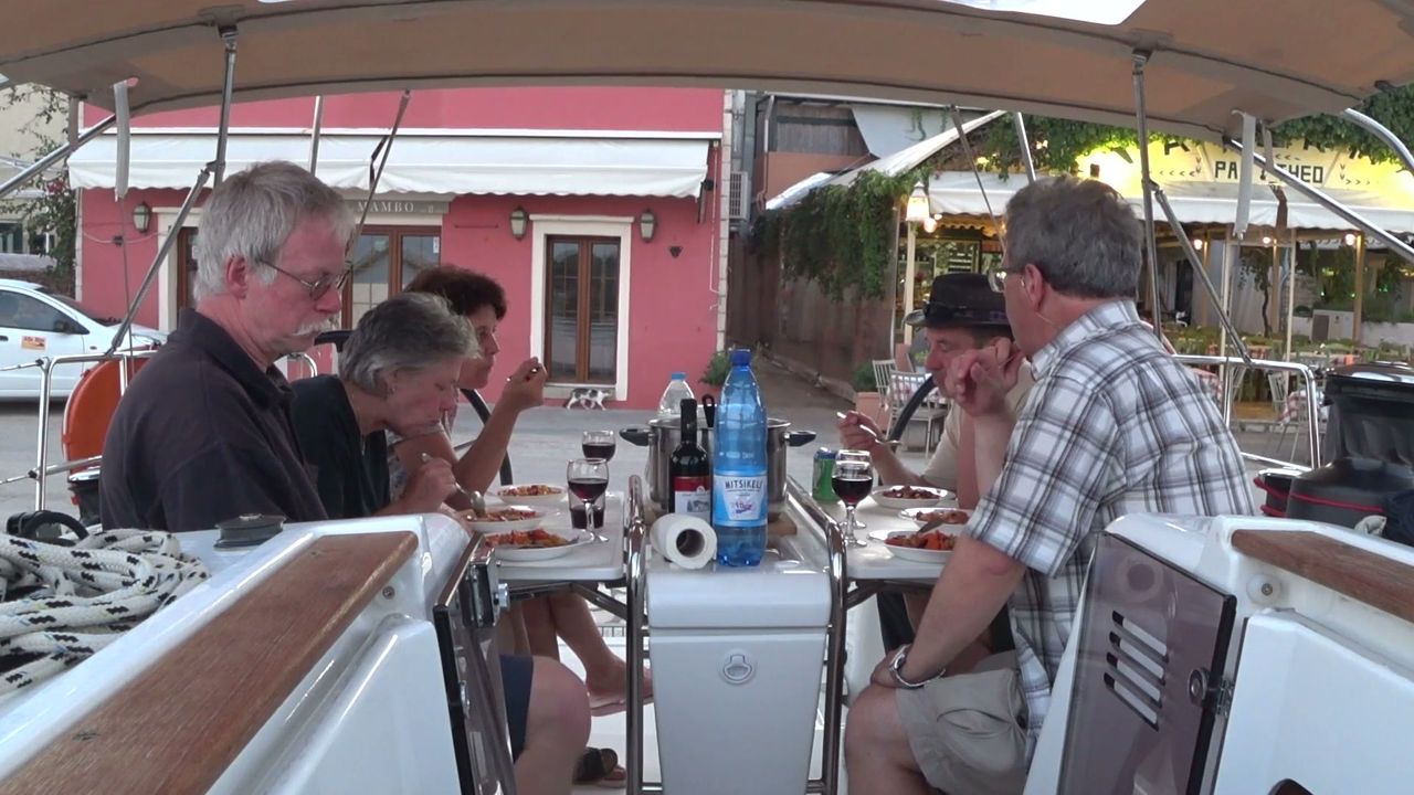 Die Einkäufe gingen zügig und der Eincheck problemlos, und so konnte die 'Rumpfcrew' Doro, Jürgen Roland und Wolfgang gegen 16:30 Uhr in Richtung Korfu Stadt auslaufen. Gegen 18:00 machten wir in der NAOK Yacht Club Marina fest. Nach kurzem Stadtbummel wählten wir die Taverne 'Porta Remounda' fürs Abendessen. Um 21 Uhr waren wir wieder zurück am Schiff und kurz darauf trafen auch die 'Nachzügler' Conny und Martin auf der 'Capri' ein. Sie hatten nur noch einen späteren Flug bekommen.